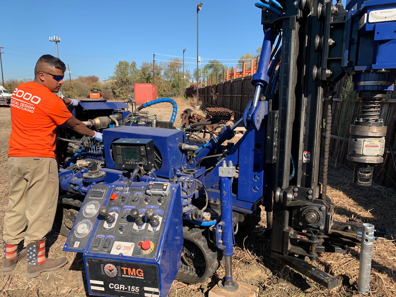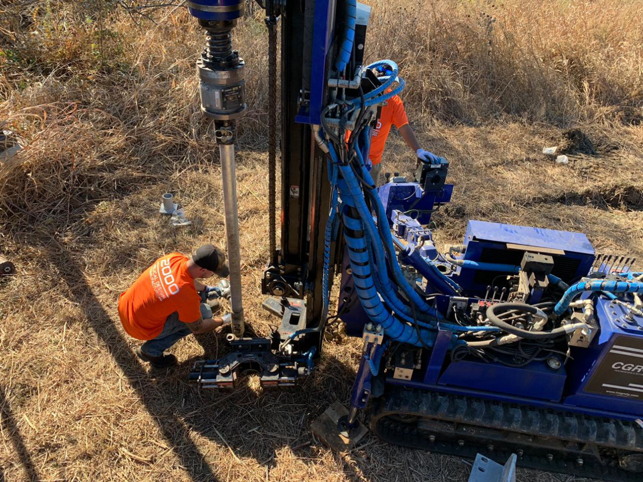 Our drilling rig is positioned at the job site, and a temporary  lead section with extensions are drilled at pre-determined points of interest.